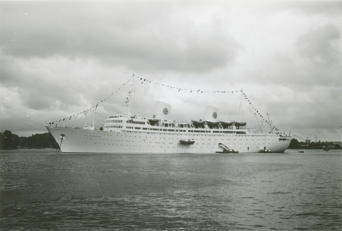 Foto från 1958 visande passagerarfartyget GRIPSHOLM av Göteborg på Stockholms ström.