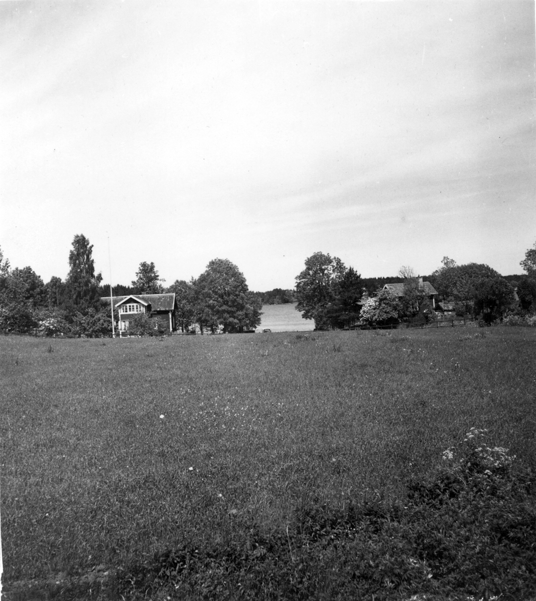 Uppland, Stockholms län, Frötuna skeppslag, Länna socken, Vettershaga. Skeppare Olssons strandställe tv, källarstuga th. Foto i juni 1950.