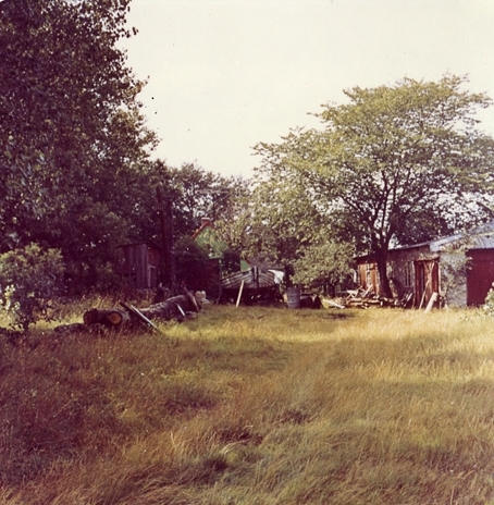 Planen framför verkstaden sedd från öster. I bakgrunden en förrådsbod och en gammal upplagd fiskebåt. Christian Madsens båtbyggeri. Foto N(ils) Nilsson aug (19)64. Danmark, Själland, Lynaes.