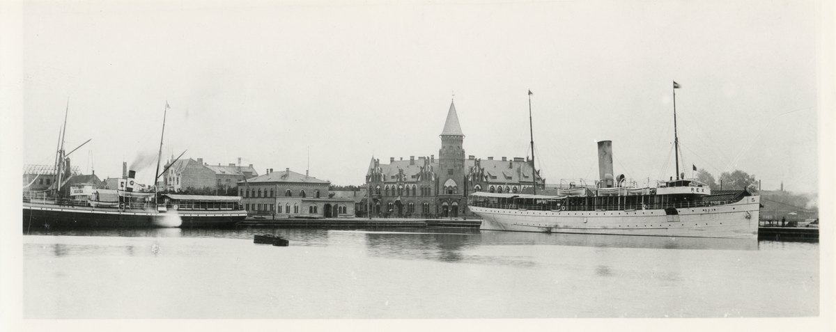 Foto i svartvitt visande passagerarångfartyget Rex t.h. och Skandia t.v. i Trelleborgs hamn.