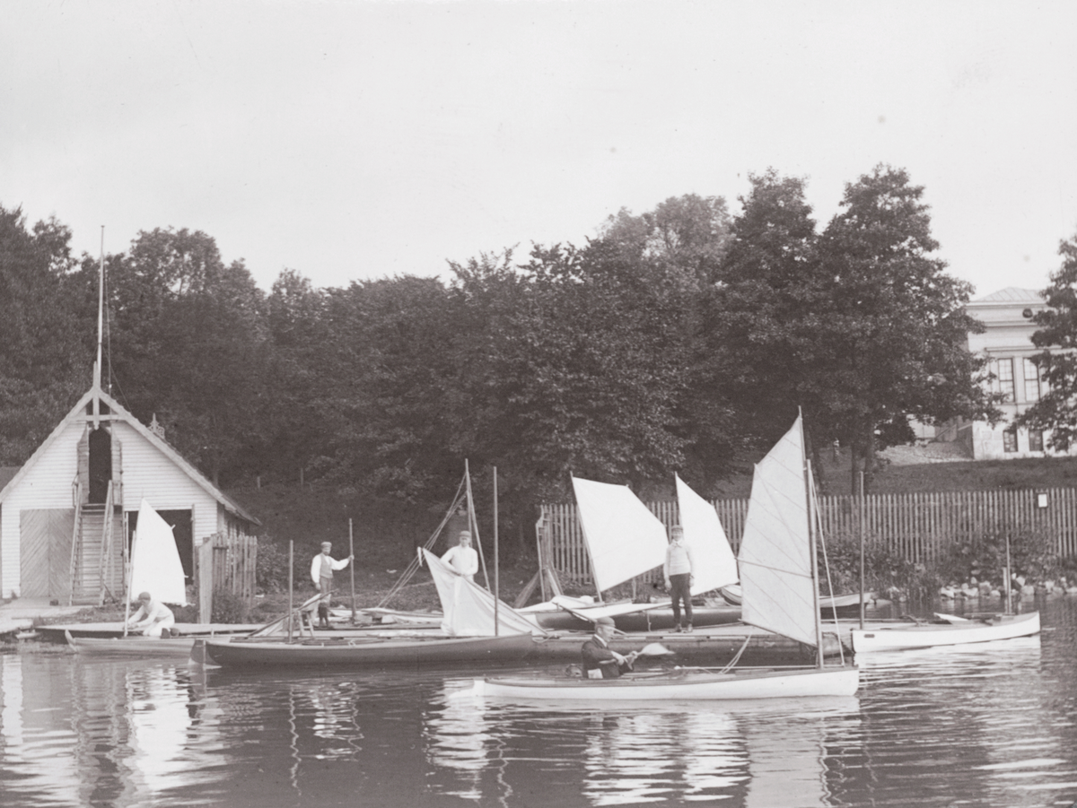 Segelkanoter vid FKI:s första klubbhus. Laboratoriehagen vid Djurgårdsbrunnsviken, Stockholm.