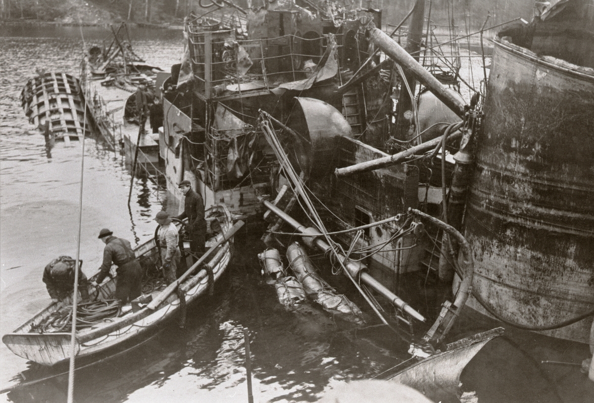 Jagaren Klas Uggla bärgas efter sprängningen på Hårsfjärden den 17 september 1941.