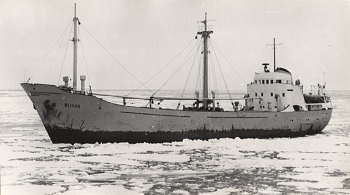 Lastmotorfartyget BLIKUR av Tórshavn - Färöarna i Öresundsisen i början av år 1963.