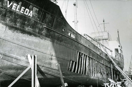 Holms skeppsvarv. S/S Veleda från Bremen repareras för skador genom isskruvning, 1956.