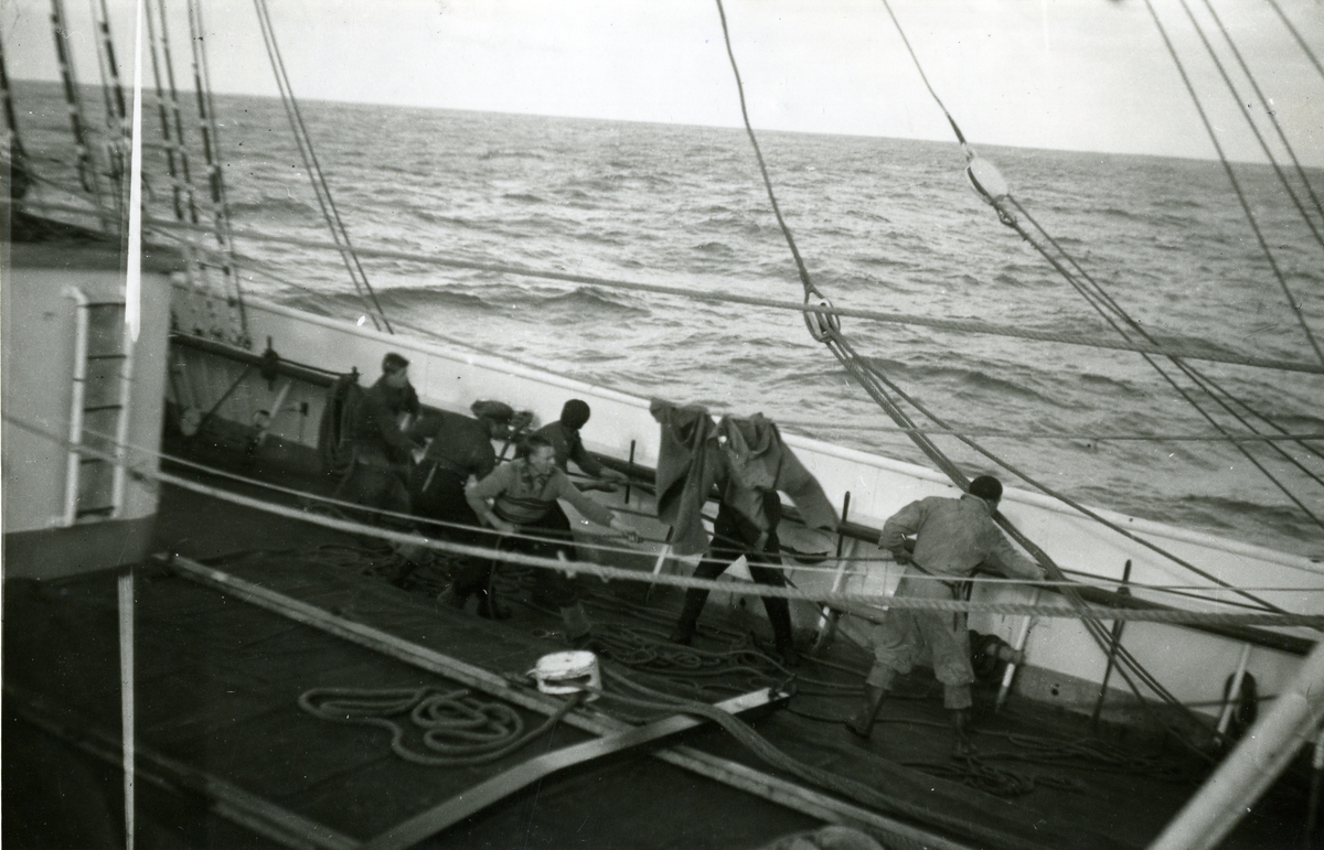 Abraham Rydberg, genomvindsvändning, förtoppen halas runt. I förhand halar Evert Borg (sedermera befälhavare på m/s Gripsholm). Foto i oktober 1934