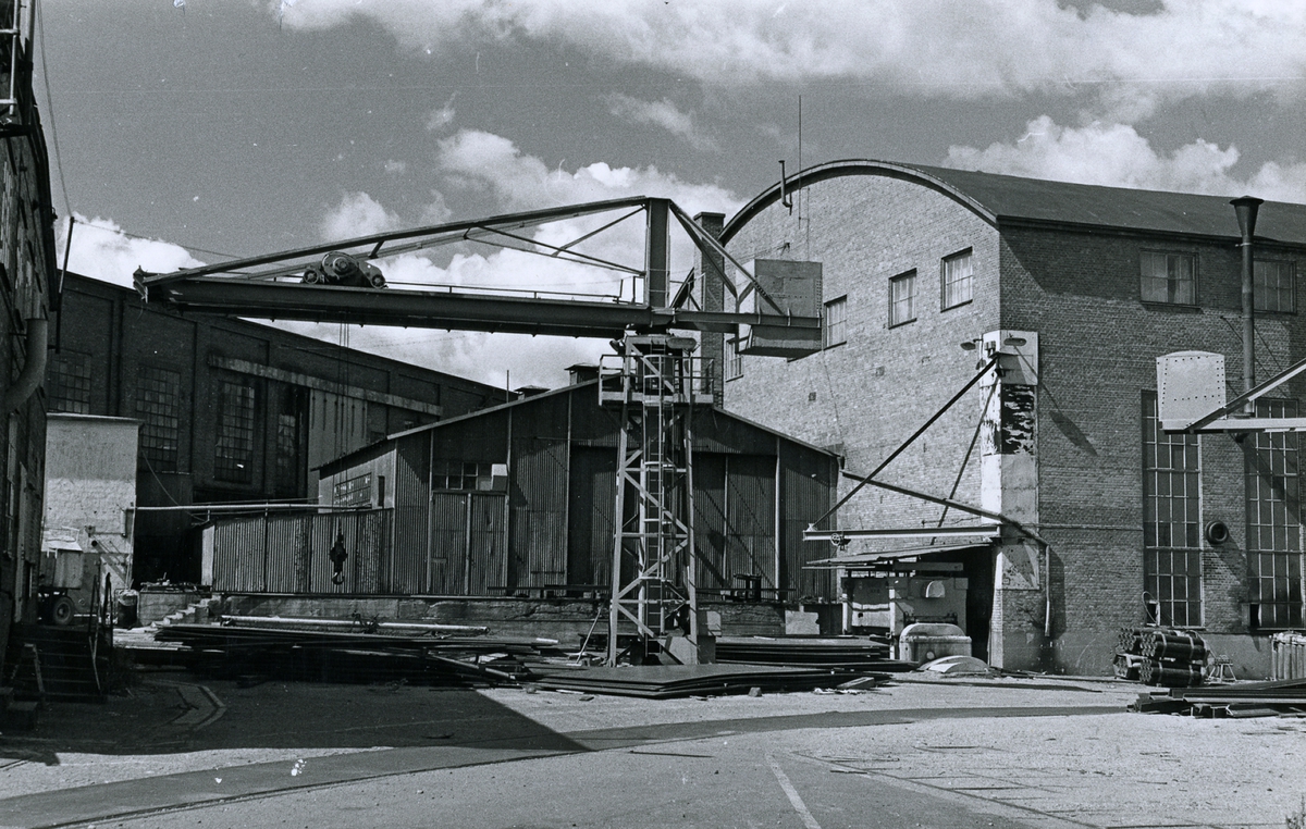 Oskarshamns varv. Plåtverkstad nr 14. I förgrunden svängbar kran tillverkad på varvet. På gaveln stora riktvalsen. Till vänster byggnad för spantplan med ugn.