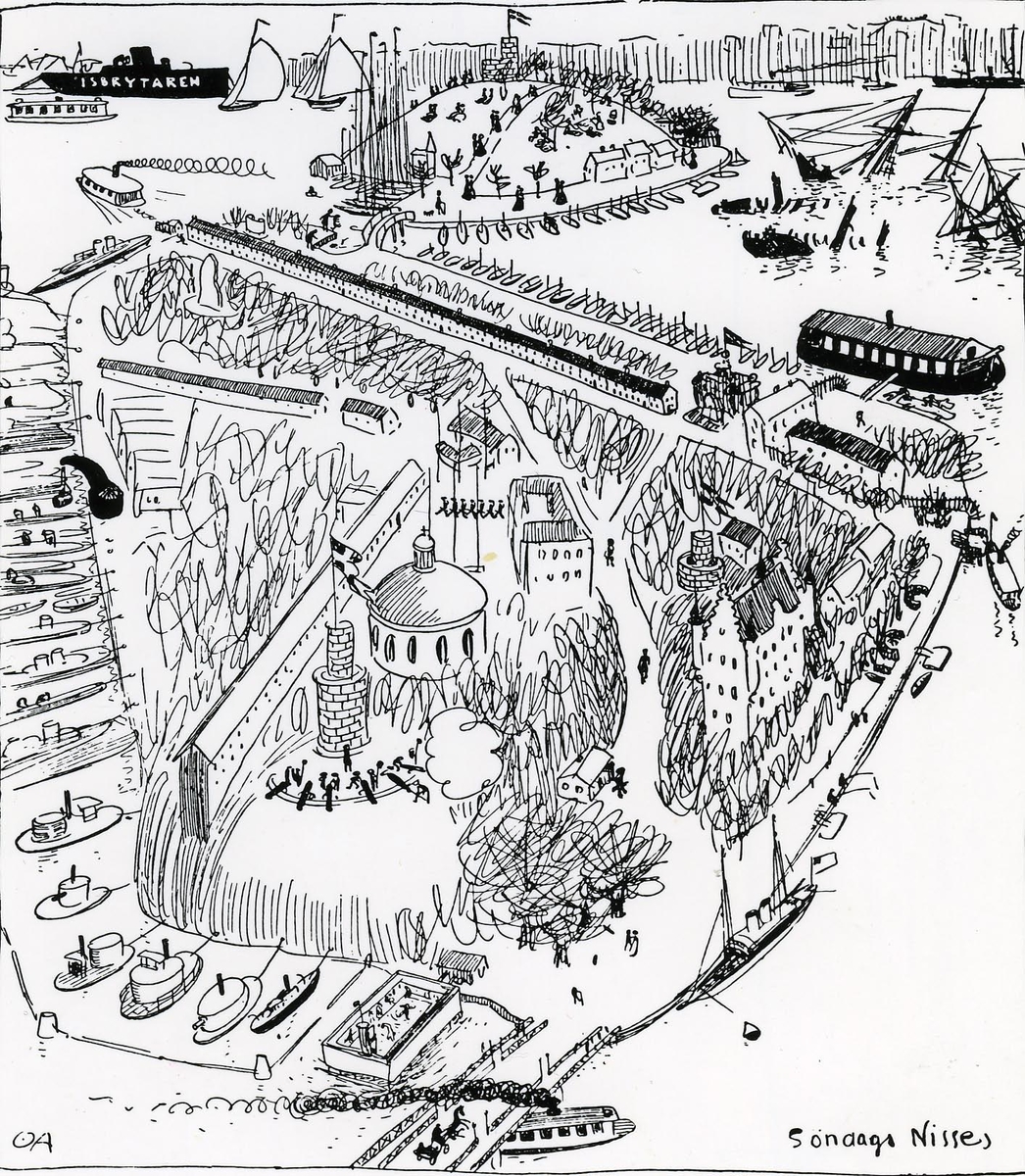 De olika förslagen till Skeppsholmens bebyggelse lockade honom att på sitt sätt uttrycka såväl sin egen som von Heidenstams och Carl Larssons meningar.