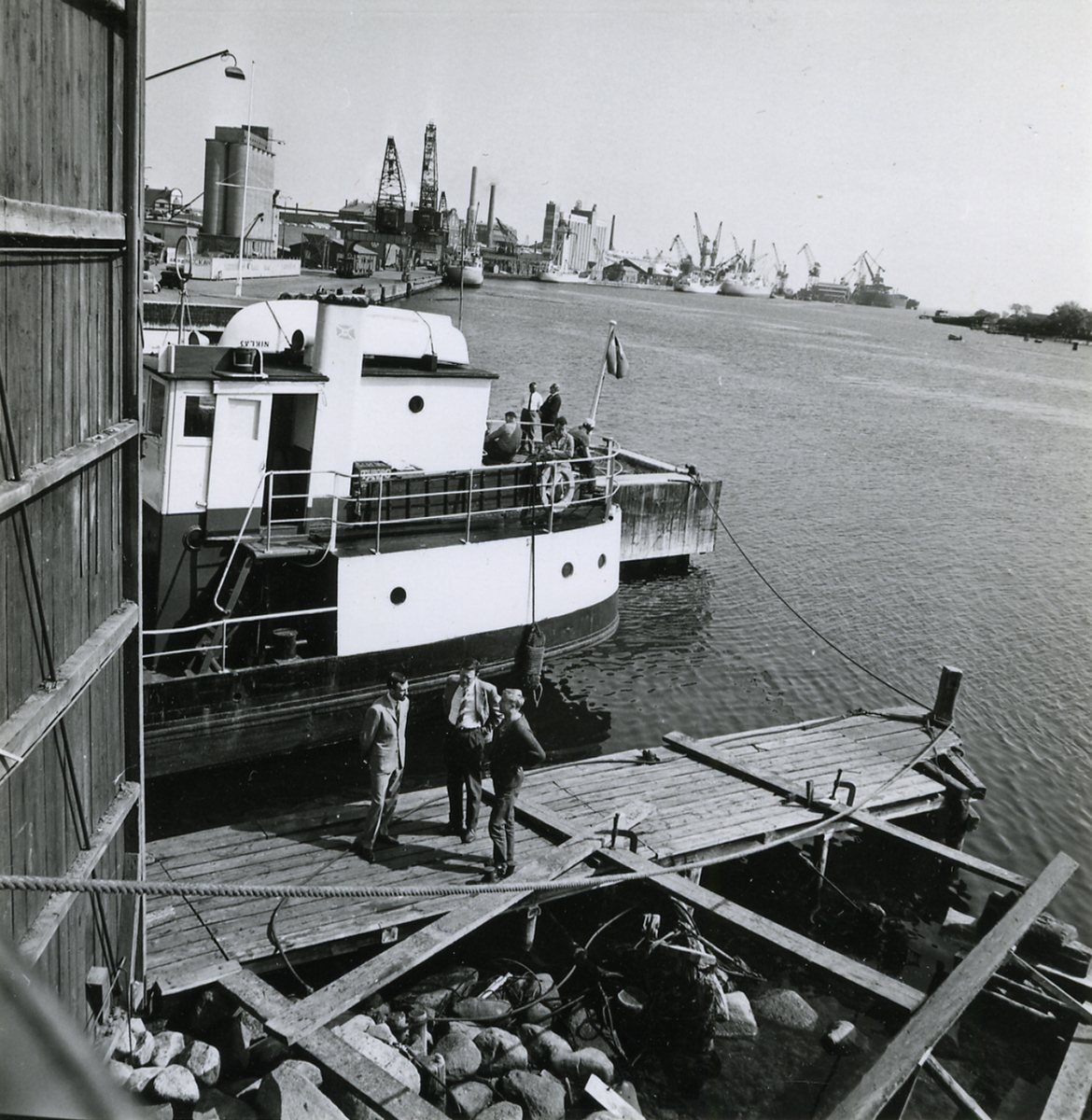 Utsikt från båtens akterdäck mot sydost. På bryggan samtalar H.Gustafssons svärson m Nils Nilsson o David Papp.