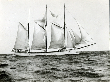 Slätriggade tremastskonaren Saga av Ven kryssande i Öresund. OBS, toppseglen satta på olika sidor för att slippa skifta vid de ideliga vändningarna.