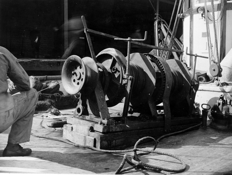 Bohuslän (fel eftersom fotografiet är i från Göteborg som ligger i Västergötland, anm. CeGe Olsson) Trawlarwinsch tillverkad av J.W. Berg, Hälsö. Fotot taget babords sida förifrån. I Fiskarhamnen i Göteborg 16/7 1934. Foto Sam Svensson
