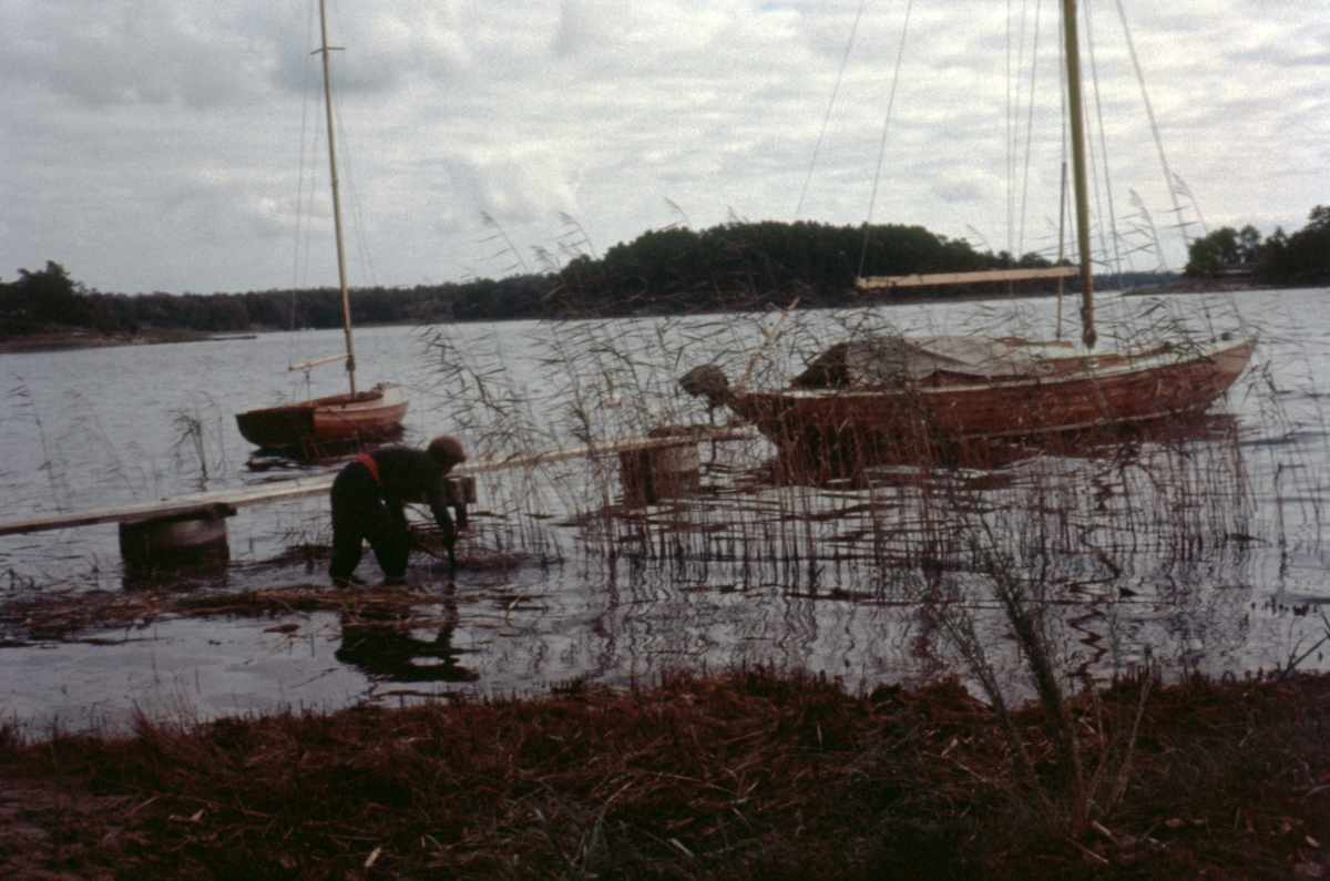 Karin Palmér klipper vass vid Djurö Kyrkudd för att skapa plats åt sin folkbåt KARP.