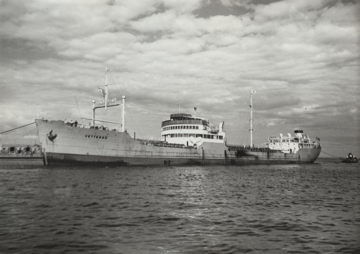 Foto i svartvitt visande malm- & tankmotorfartyget "VETTERSÖ" taget i Köpenhamn någon gång under åren 1956 - 1962.