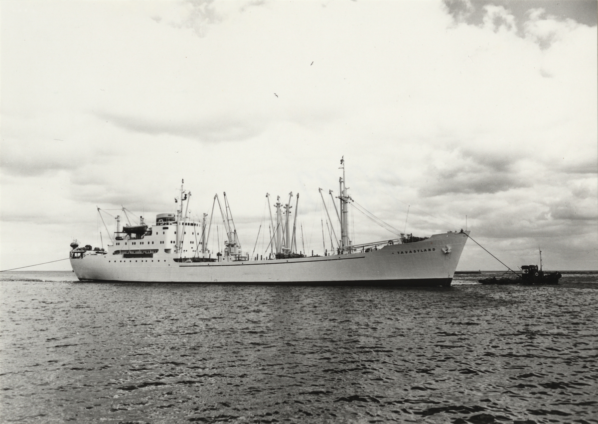 Foto i svartvitt visande lastmotorfartyget "TAVASTLAND" i Köpenhamn under juni månad 1958.