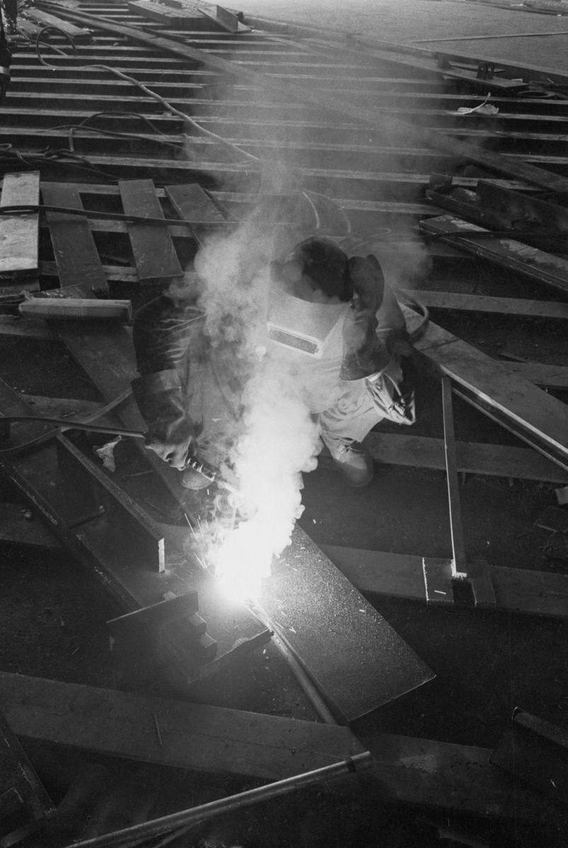 Titel: Ekensbergs varv 1970. Svetsare i arbete i stora plåthallen.