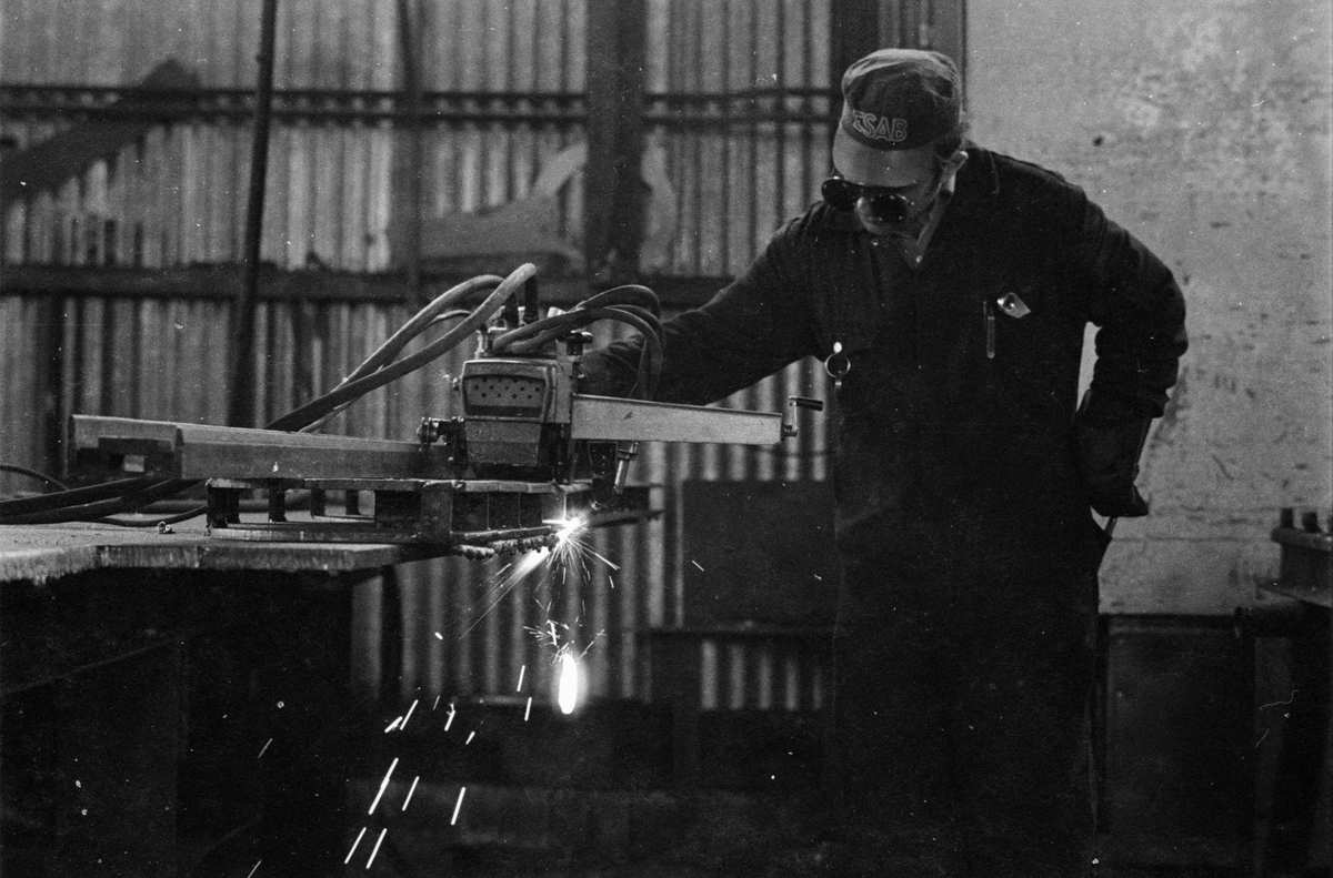 Ekensbergs varv. Varvsbyggnad interiör, verkstadsarbetare vid maskin.