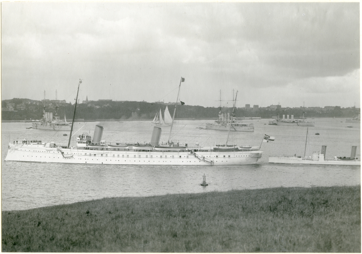Den tyska kejserliga jakten HOHENZOLLERN på väg in mot Kiel. I kölvattnet på HOHENZOLLERN ses den kejserliga depeschbåten SLEIPNER (ex S97), liksom HOHENZOLLERN med vitt skrov och gula skorstenar. I bakgrunden fartyg ur tyska flottan.