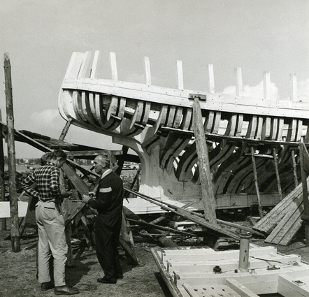 Kravellbyggd fiskebåt under byggnad för Grönlands Handels räkning. Observera att skrovet är överstruket med kalk till skydd mot röta och uttorkning under byggandet. Personerna är Ole Crumlin-Pedersen, Olof Hasslöf (skymd) och Christian Nielsen. Danmark, Fyen, Fåborg.