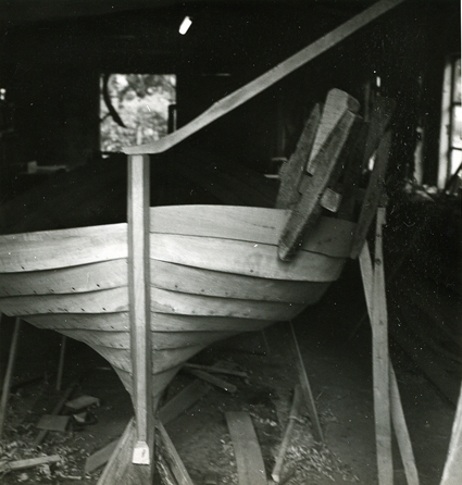 Akterstäven på en Lynaes-jolle under byggnad. En skabelon till översta bordets akterdel är påsatt för måttagning. se uppt. klinkbyggnad. Christian Madsens båtbyggeri. Foto N(ils) Nilsson aug (19)64. Danmark, Själland, Lynaes.
