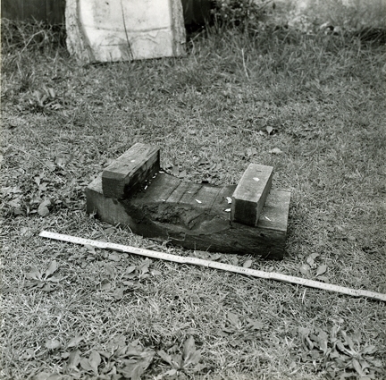 Träkloss (-klots) att lägga under kölen när man drar båtar över land. den är avsedd att smörjas med fett, varav namnet "fettlapp". Christian Madsens båtbyggeri. Foto N(ils) Nilsson aug (19)64. Danmark, Själland, Lynaes.