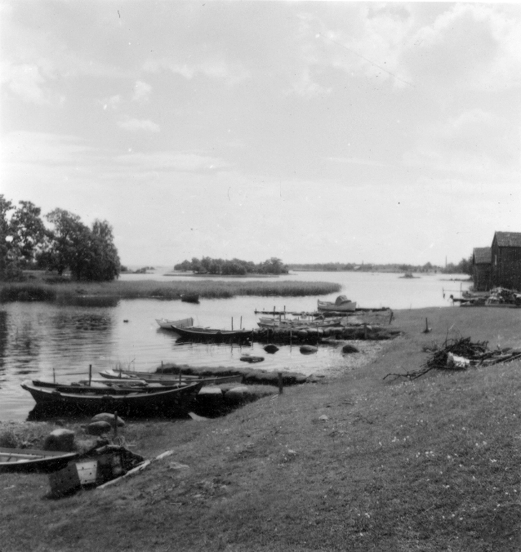 Småland. Kalmar län, Stranda härad, Ålems socken, Pataholm. Hamnen med småbåtar liggande i sina kåsar.