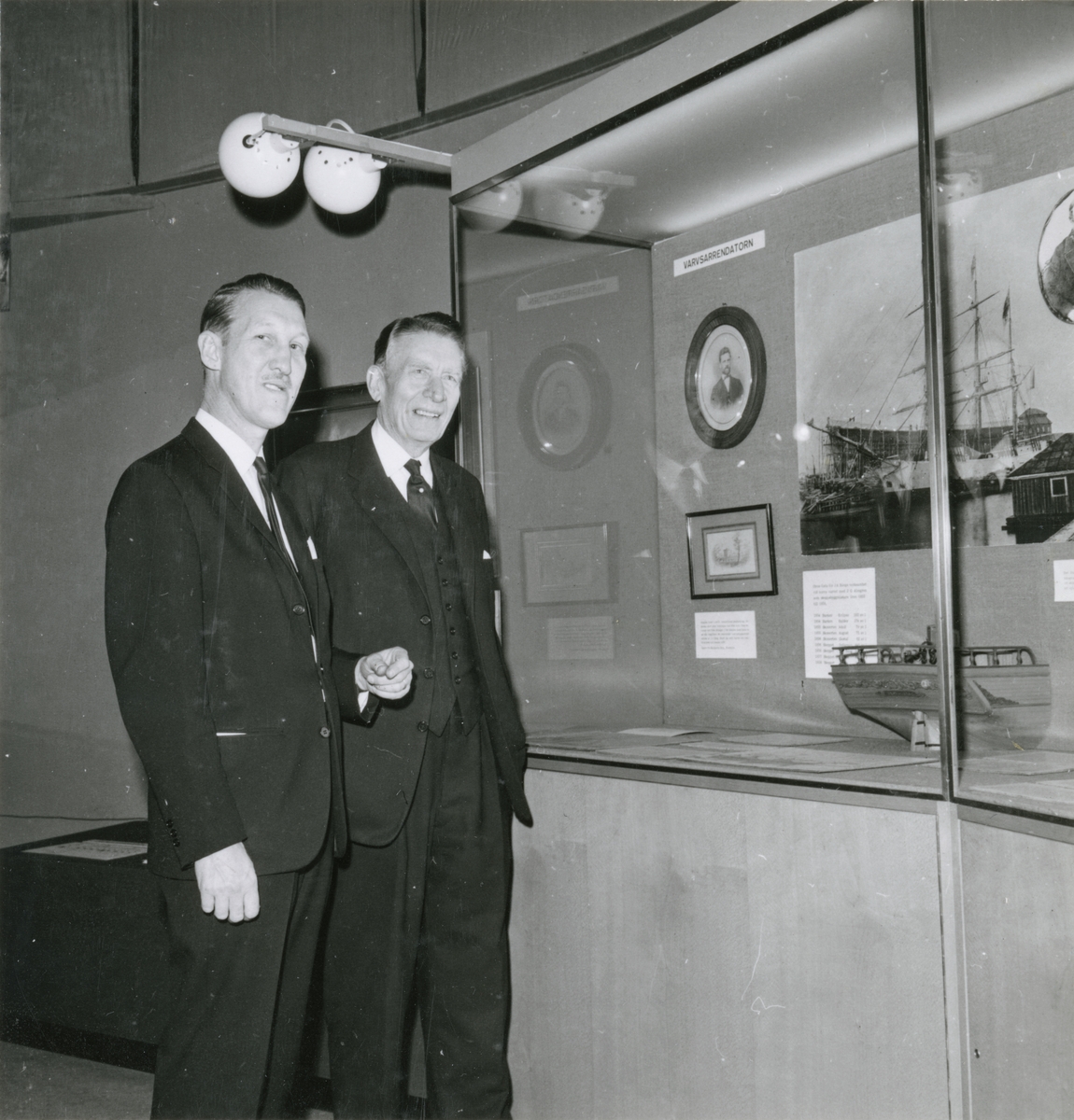 Utställningen "Herrarna Bång". Vernissagen. Till vänster står museidirektör Per Lundström och till höger skeppsredare Emanuel Högberg.