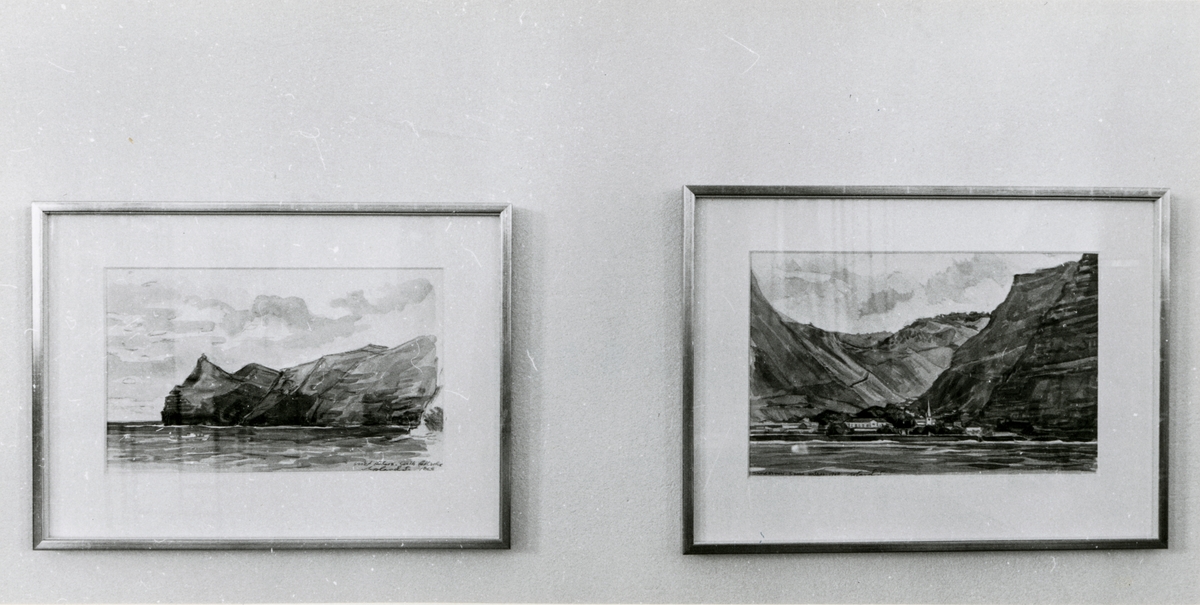 Utställningen "Sankt Helena en resa och en bok", akvareller och litografier av Roland Svensson. Exempel på två utställda konstverk.