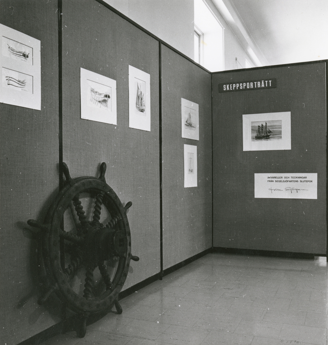 Utställningen "Skeppsporträtt av Folke Sjögren, akvareller och teckningar från segelfartygens slutepok". Inledningsskärmen.