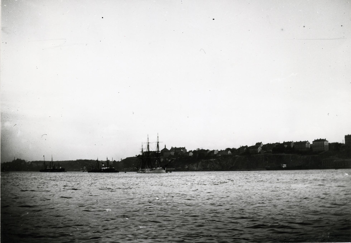 Ett av flottans övningsfartyg till ankars. Troligen ångkorvetten Saga samt några ångare. I bakgrunden Stadsgården med Fjällgatan och Ersta.