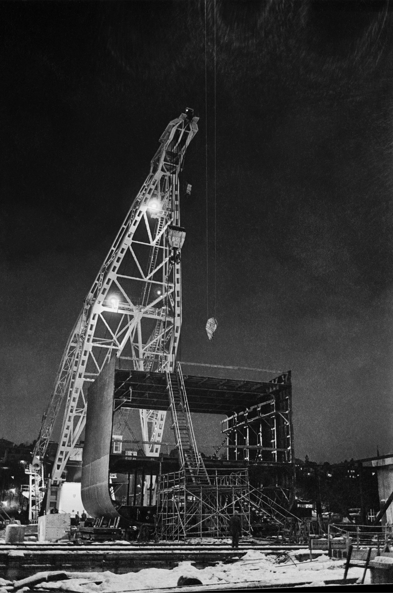 Ekensbergs varv 1970. Transatlantics lastfartyg SCANDIC förlängs, den nya sektionen ska lyftas på plats av pontonkranen LODBROK.