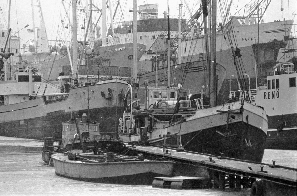 Fartyg på Ekensbergs varv 1970. På bilden ses bl. a. de finska lastfartygen SVANSJÖ (urspr. FINKENWARDER) och MARIESTRAND (urspr. BLÀFELL) samt bogserbåten RENÖ (urspr. marinens hjälpfartyg SÖKAREN). Vidare i lilla dockan det danska lastmotorfartyget TONNA samt i stora dockan det Panama-registrerade lastmotorfartyget BECKY.