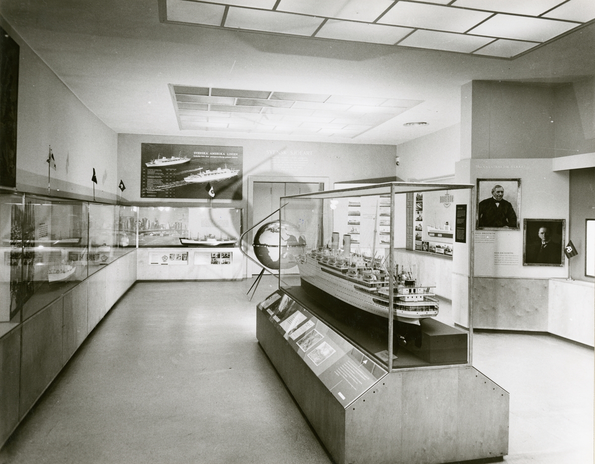 Interiör från Sjöhistoriska museet. Broströmskoncernens utställning i Sjöfartsavdelningen, rum18. Fartygsmodeller, porträtt av Axel Broström samt Dan Brostöm m.m.