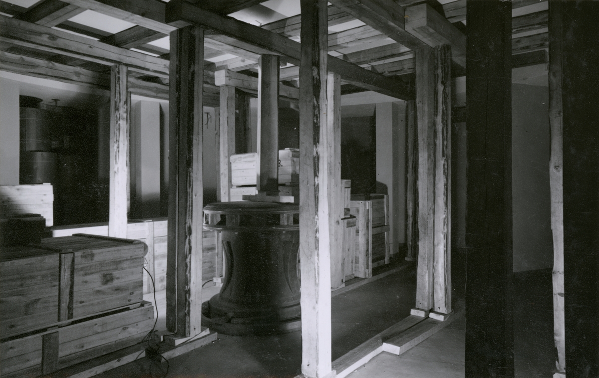 Luftskyddsåtgärder i Sjöhistoriska museets utställningar. Interiör av Runda rummet i suterrängvåningen. Bjälklagret förstärkt med tvärbalkar och stöttor. I bakrunden lårar för nedpackning av föremål.