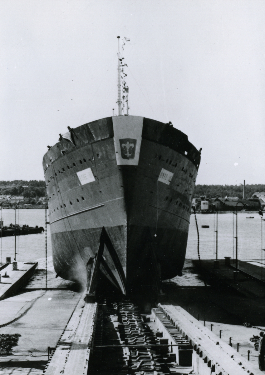 Ångfartyget BORE III. Har börjat löpa av stapeln efter dopet 1.7.1952.