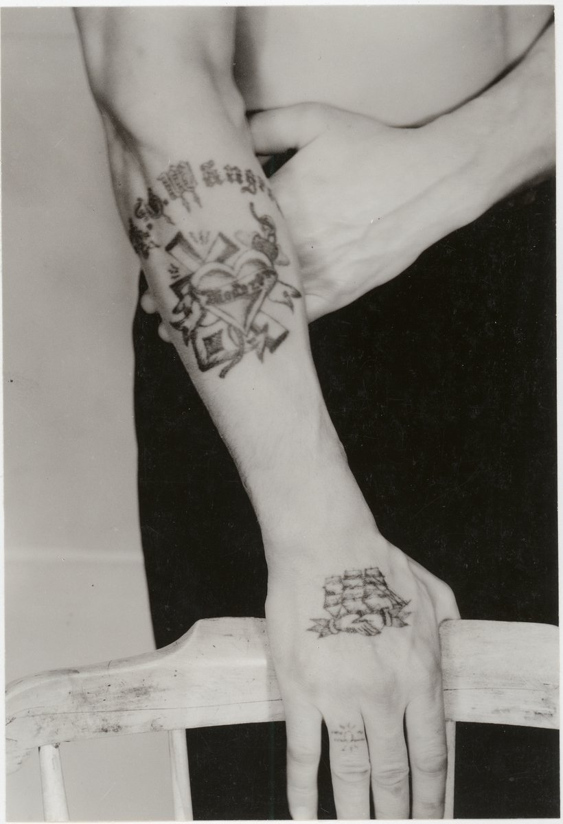 Matrosen Karl Wängren. Höger under arm: övre partiet stucket i köpenhamn 1917, skeppet stucket i Calcutta 1921 till ett pris av 3,5 ruppes.