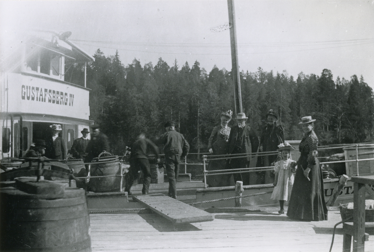 Ångfartyget GUSTAVSBERG IV vid Boo-Stäkets brygga. Till höger familjen Kempff.
