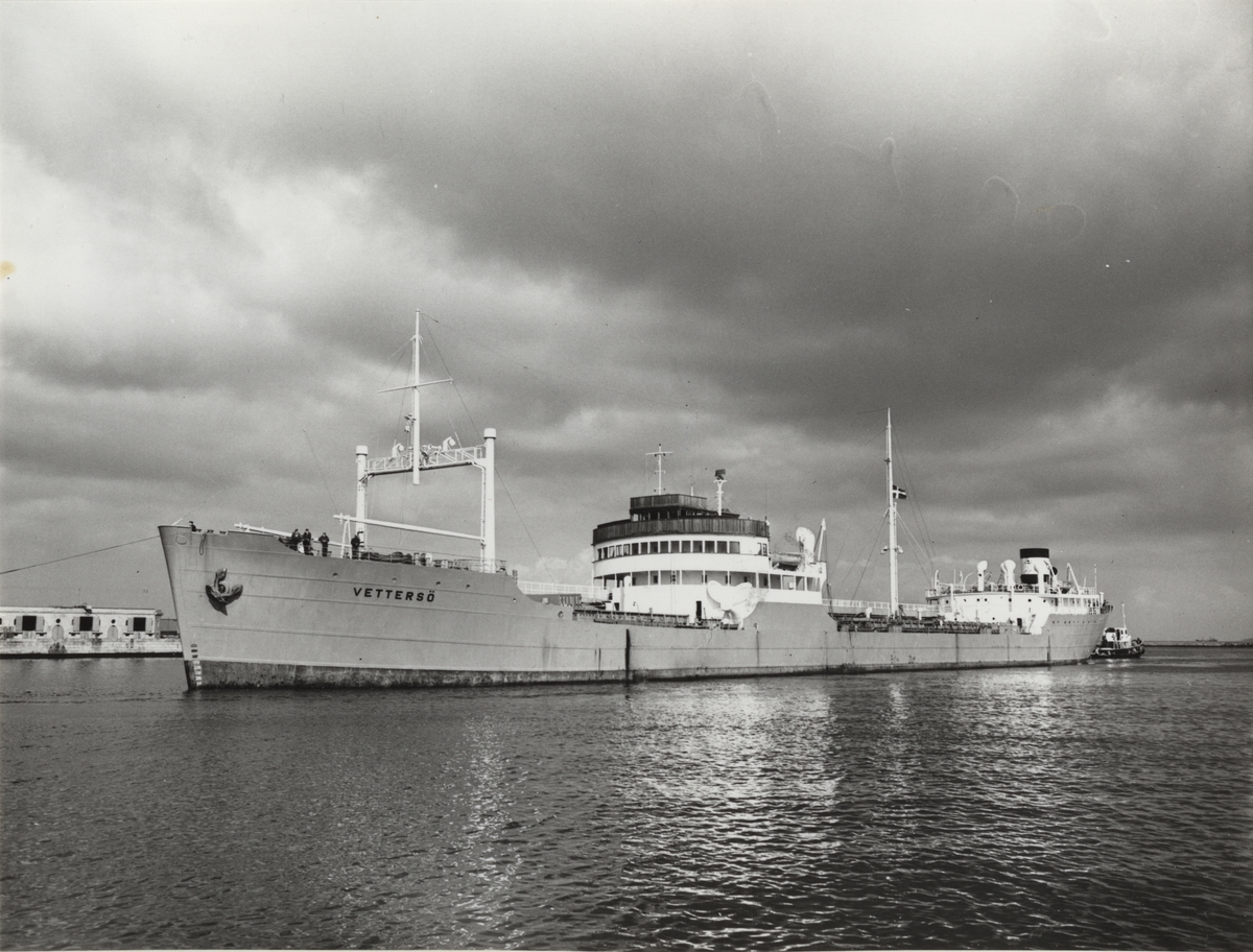 Foto i svartvitt visande malm- & tankmotorfartyget "VETTERSÖ" taget under april månad 1962.