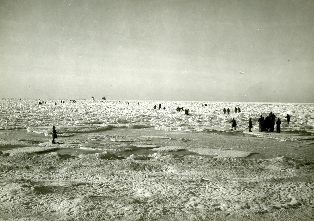 Isen utanför Visby i februari 1940. Folkvandring ut till de fastfrusna ångarna.