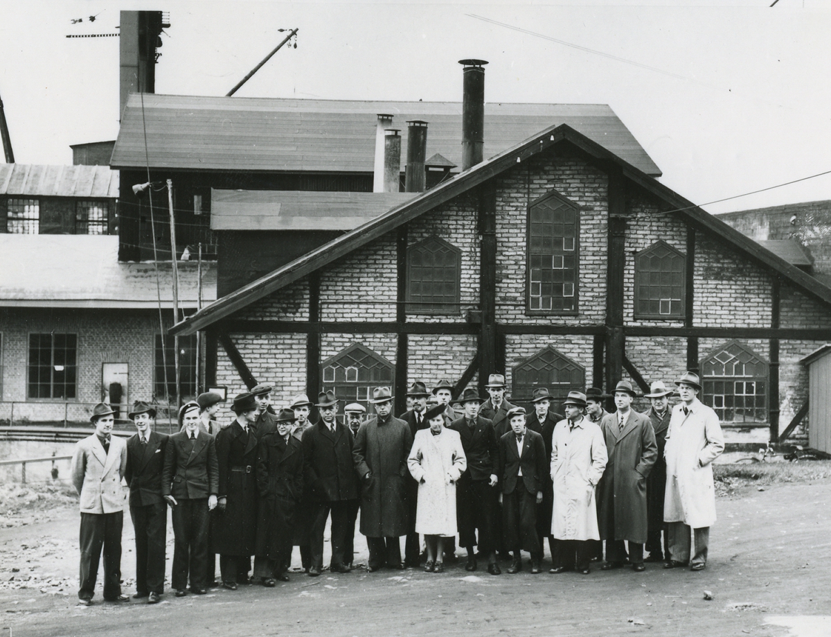 Oskarshamns varv. Varvets tjänstemän år 1941. Imitten chefen Segerdahl med sin sekreterare Birgit "Biggan" Carlsson. Mellan dem ingenjör Adolf Johansson, chef för Plåtsidan. 8:e till höger om Segerdahl Hellhammar, förste man på ritkontoret. Till vänster om Segerdahl Lamberg och ingenjör Larsson, chef för Maskinverkstaden.