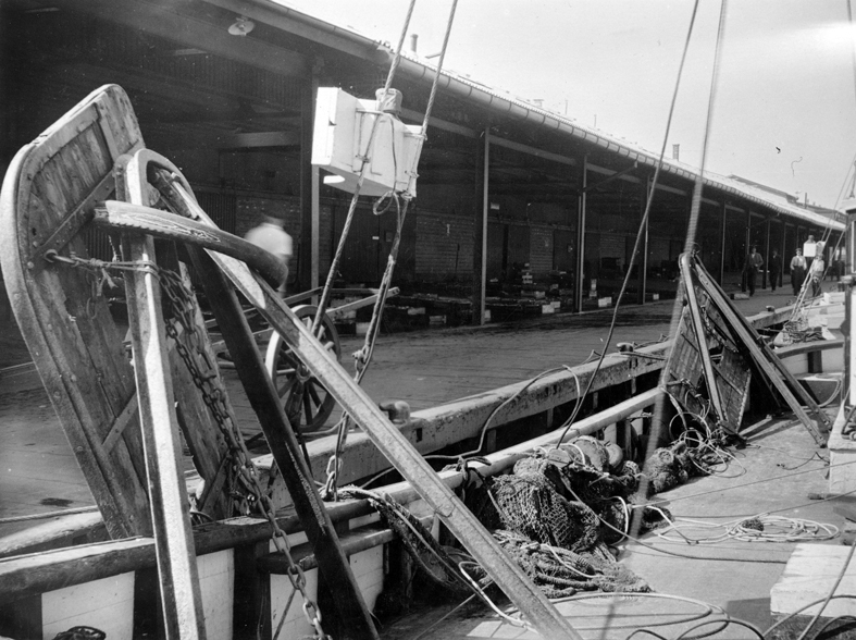 Bohuslän (fel eftersom fotografiet är i från Göteborg som ligger i Västergötland, anm. CeGe Olsson) Däcket med trawgaljar och "dörrar". I Fiskarhamnen i Göteborg 16/7 1934. Foto Sam Svensson