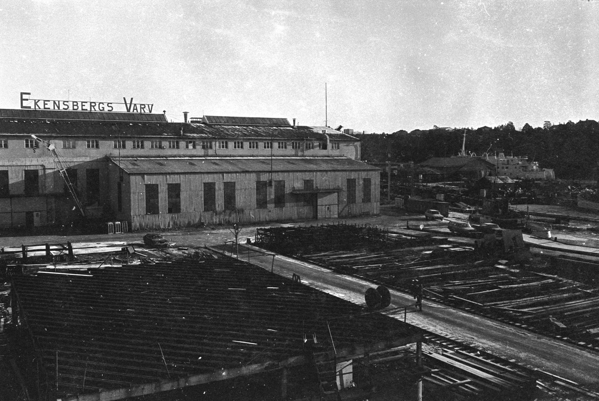 Ekensbergs varv 1970, stora plåthallen. På avstånd t h skymtar Gotlands-färjan POLHEM (urspr. KRAAKERØ).