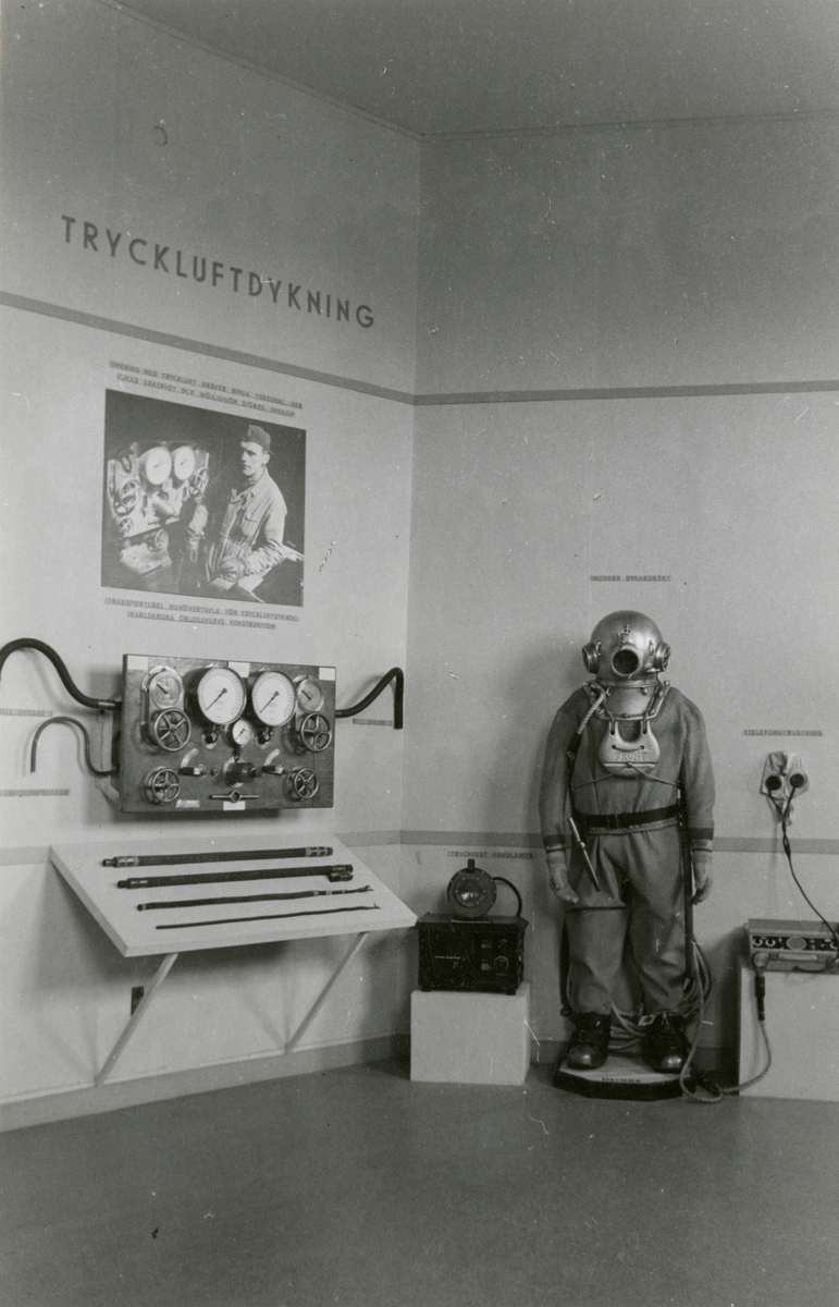 Tillfälliga utställningen "Dykeri och bärgning". Presentation av tryckluftsdykning. Transportabel manövertavla för tryckluftsdykning, dykardräkt, tryckfast handlampa, telefonutrusting m.m.