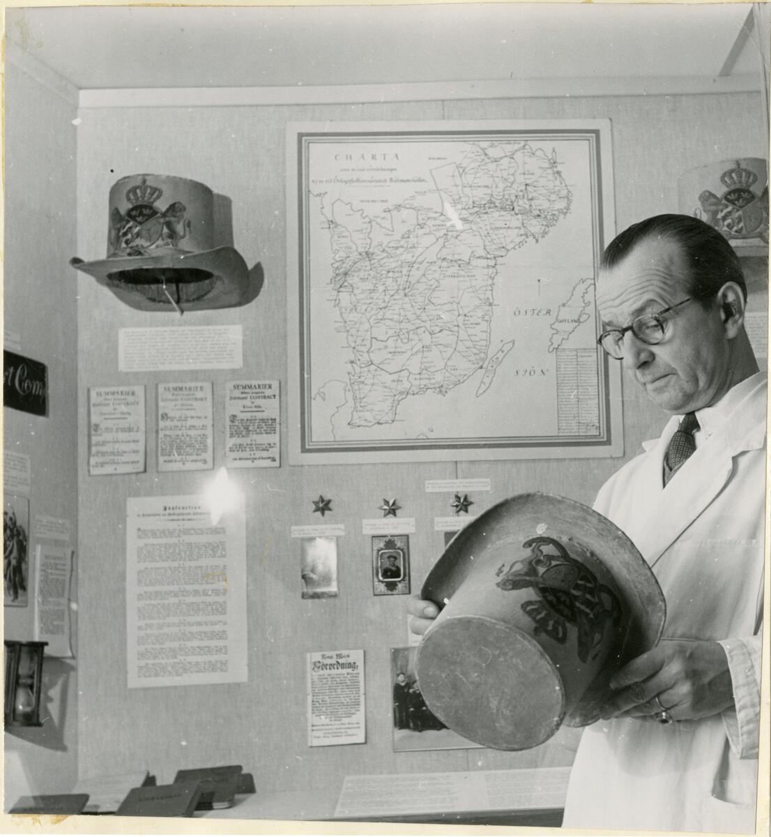 Utställning i rum 7 i Örlogsavdelningen, östra väggen. Kommendörkapten greve E Hamilton håller en matroshatt från fregatten GALATHEA i handen.