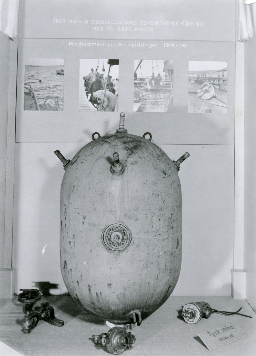 Utställningen "Svensk sjömannagärning i allvarstid". Sal 3. Visar mindesarmering samt en tysk mina från perioden 191418.