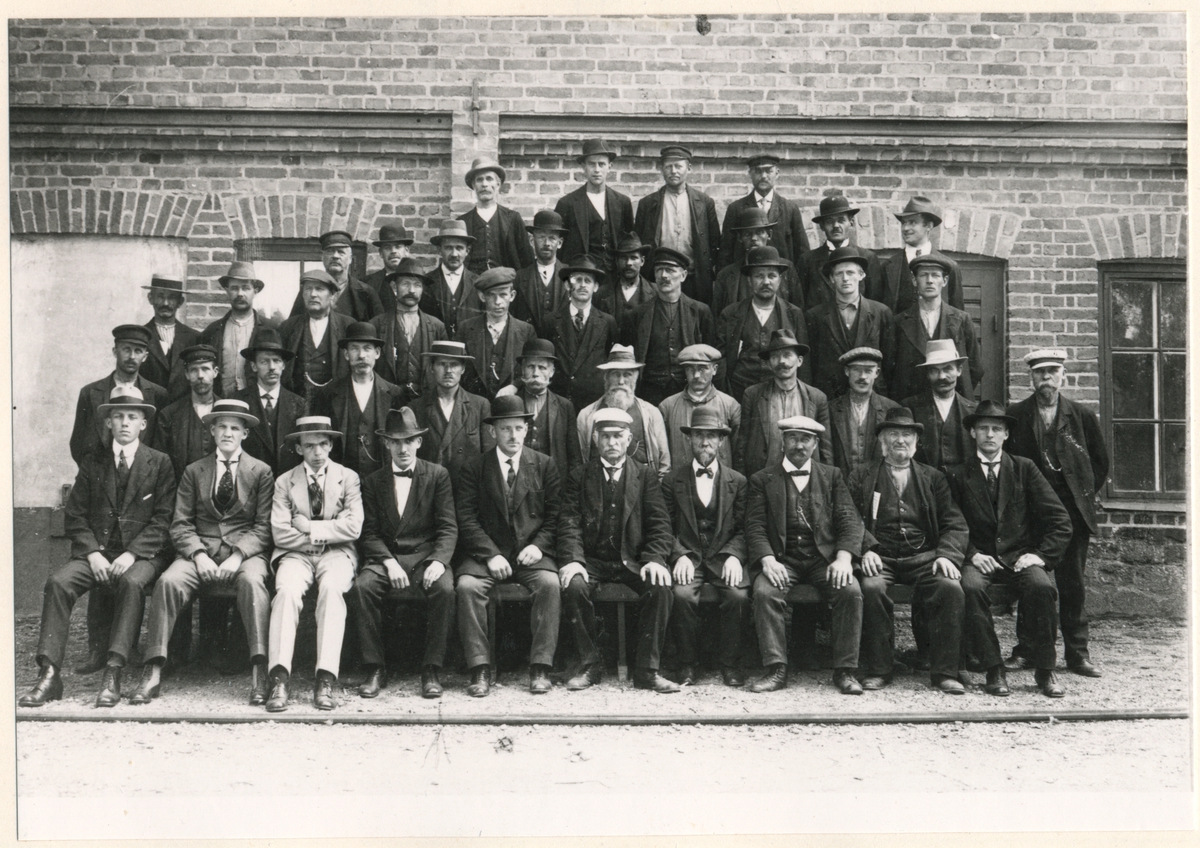 [anteckning på Fotobeskrivning:] "Gruppbild av arbetare och tjänstemän vid Byggnadsdepartementet vid Flottans varv i Stockholm 1911. Kopia hos Anton Pettersson, Cardellsgatan 3, Sthlm Ö."