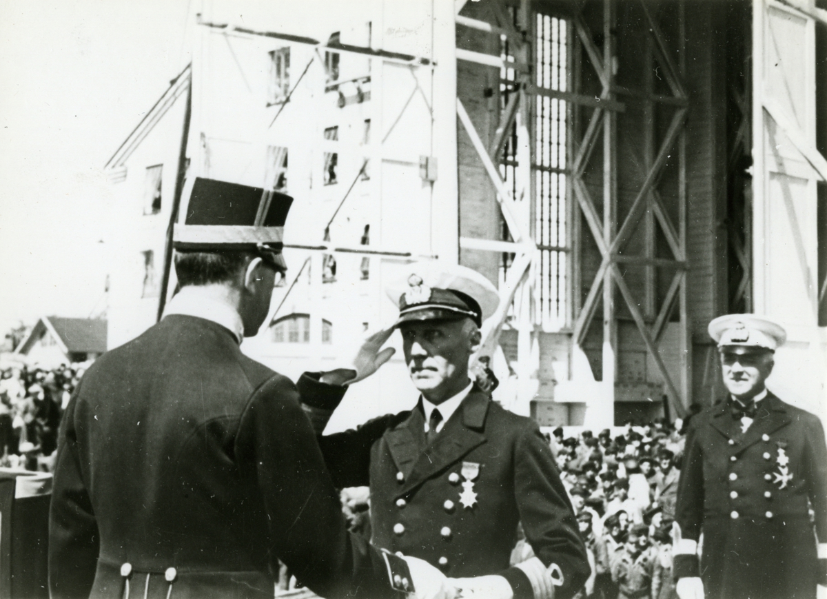 Jagaren KARLSKRONA har just sjösatts i Karlskrona den 16.6.1939 efter det Kronprins Gustaf Adolf utropat jagarens namn. Kronprinsen överlämnar ordenstecknet av Nordstjärne-orden till CID marindirektör Gustaf Halldin. Marinöverdirektör Yngve Schoerner ser på.