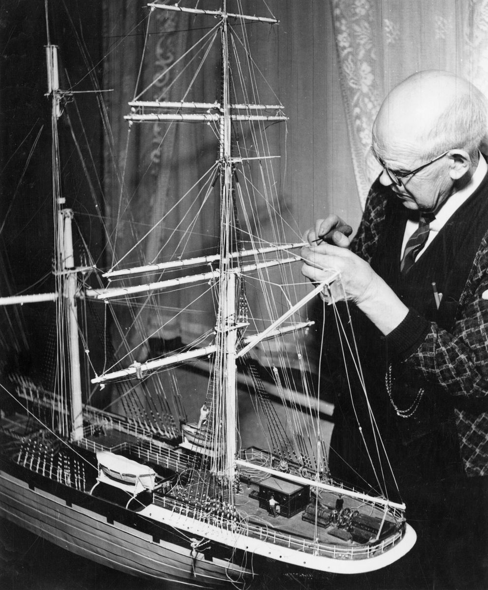 Tulluppsyningsman Bror Bengtsson, Halmstad, med sin modell av den brittiska fullriggaren CANTERBURY.