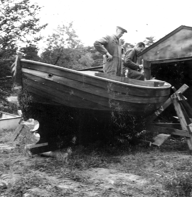 Skåne, Kristianstads län. Ängelholm, Luntertun. Karl Ingelbergs båtbyggeri. Senaste nybygget.Ingelberg inspekterar arbetet medan sonen stryker båtlack.
