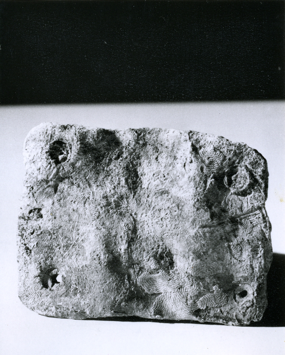 Blyplatta med fyra hål (för tätning eller dyl.?) 6 x 4,5 cm, från vraket Marianne vid Simpnäs i Stockholms län.