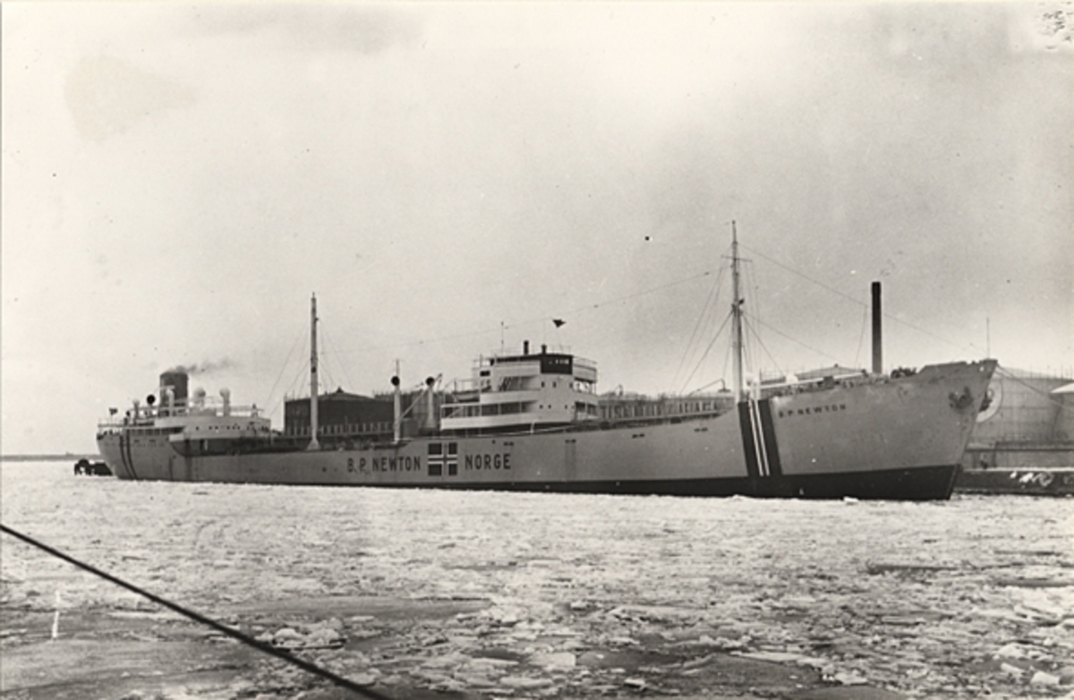 Foto i svartvitt viande tankmotorfartyget "B.P.NEWTON" av Oslo vid kaj i Köpenhamn i början av 1940-talet.