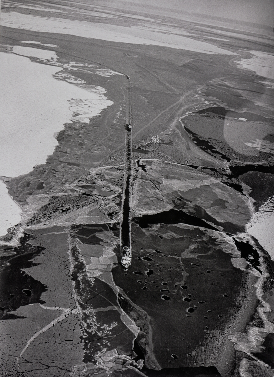 Flygbild av isränna med isbrytaren Tor längst fram. Isbrytning i Östersjön.